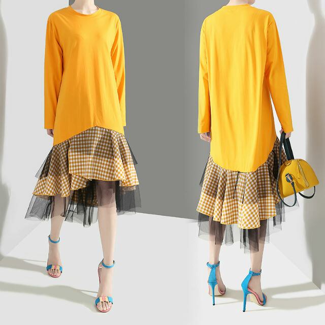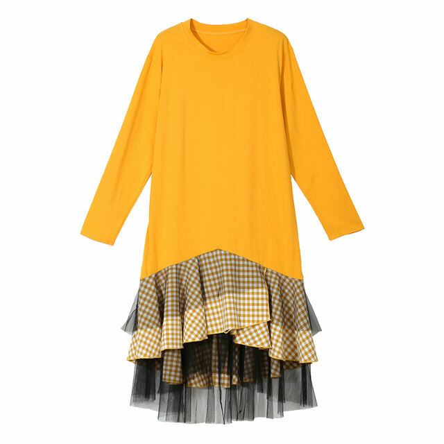 レディース ドッキングワンピース シンプルロングTシャツプラスチェック柄スカート アシンメトリースタイル (DCT-586158376562)