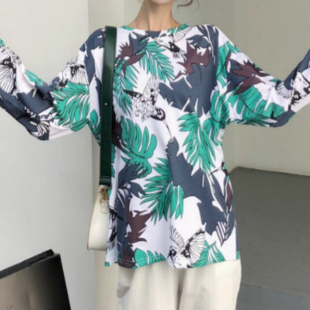 ドロップショルダーでゆったりデザイン、鳥と葉っぱが描かれたカットソーです。