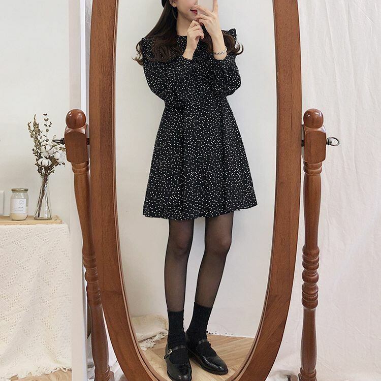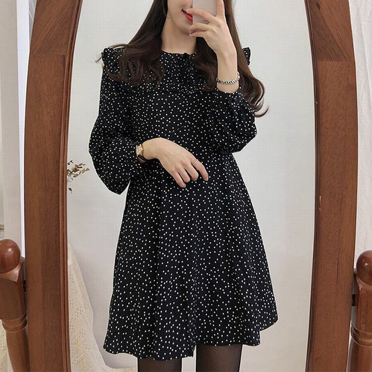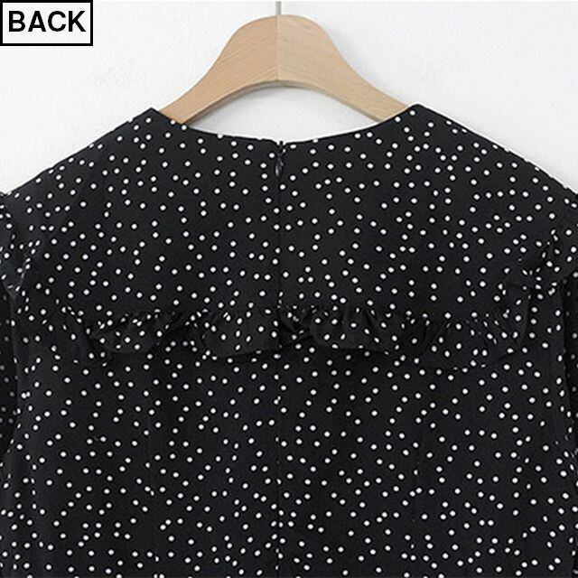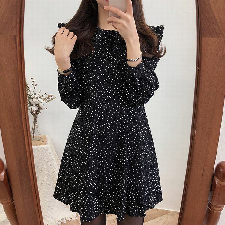 レディース 水玉シフォンワンピース ミニ フリル 春コーデ / Women's Spring and Autumn Polka Dots Chiffon Dress Retro French Girl platycodon (DCT-586958458291)