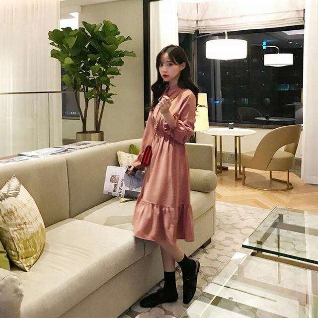 レディース ボウタイ フリル ワンピース 春コーデ / Pphome Skirt Women's Retro Style Chic Waist Long Sleeve Dress (DCT-579113075152)