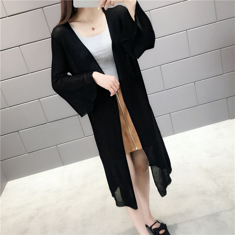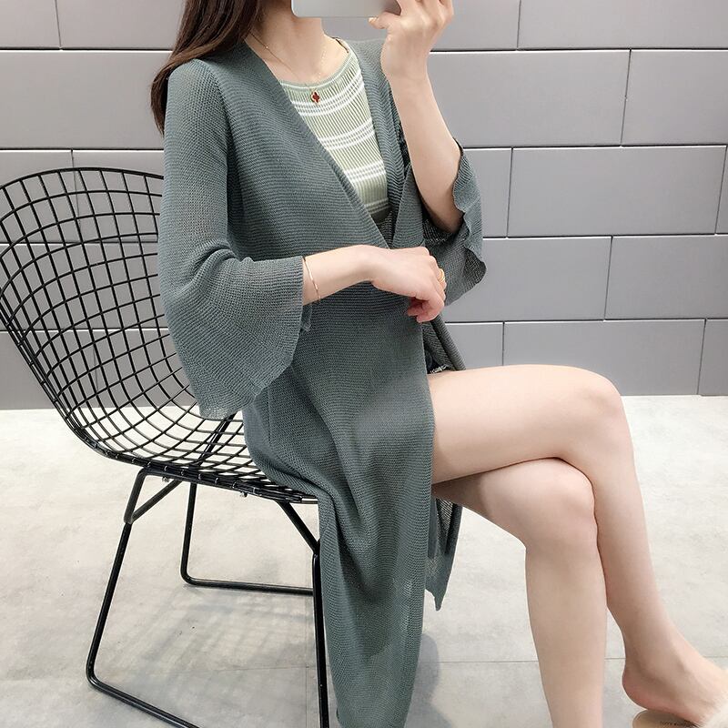 レディース フレア袖 ロングカーディガン 七分袖 薄手 春コーデ 夏 / Long Solid Color Ice Silk V-neck Cardigan with Trumpet Sleeves (DCT-589248344715)
