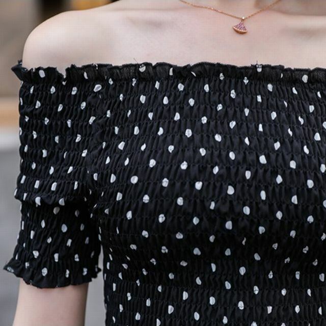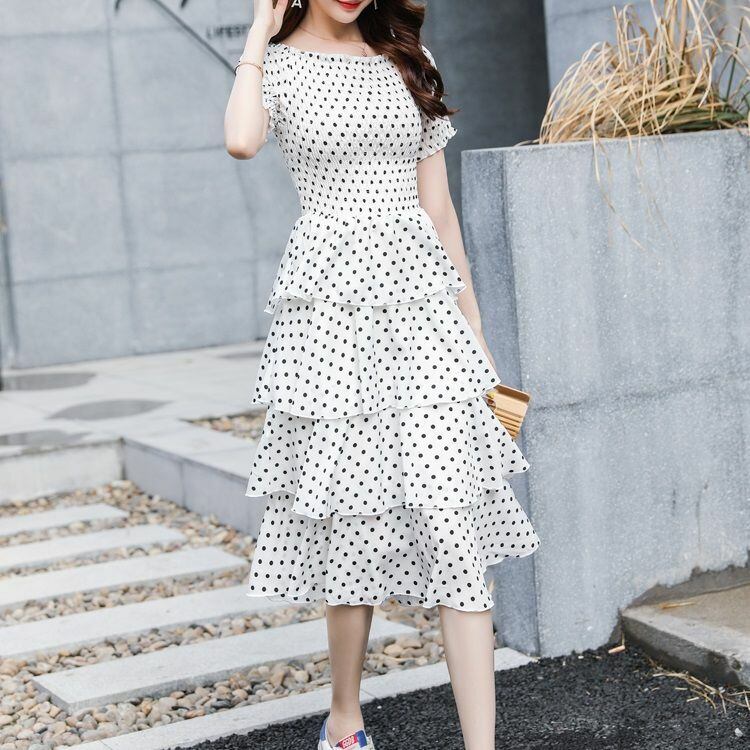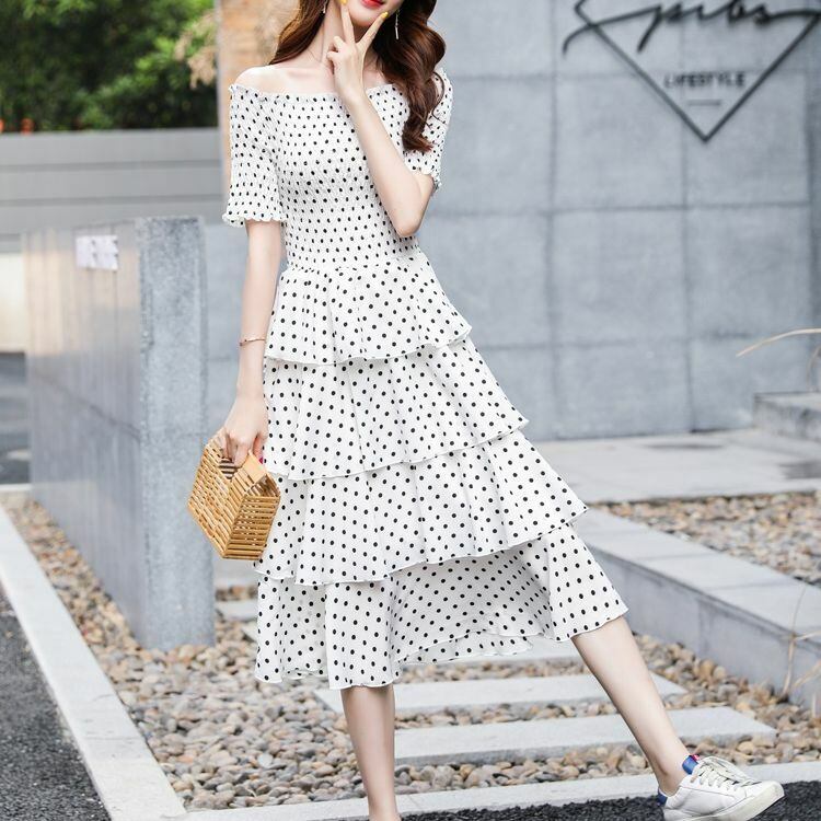 レディース ドット柄 4段フリルワンピース オフショルダー ティアード フェミニン 春コーデ 夏コーデ / Waist Slim Chiffon Word Shoulder Polka Dots Cake Skirt Dress (DCT-592639253356)