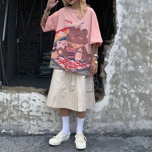 レディース 可愛いクマプリント Tシャツ ゆったり 半袖 インスタ映え 韓国ファッション オルチャン ホワイト ピンク / Loose Insuper Fire cec Ocean Design T-shirt (DCT-598301314181)