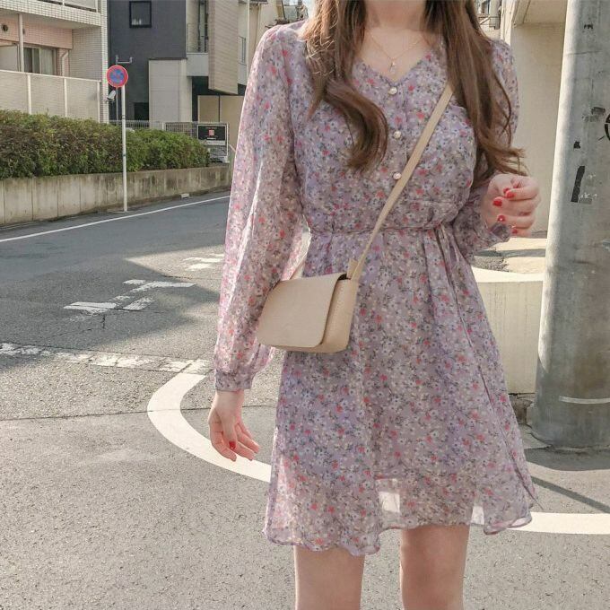 レディース レディースファッション ワンピース 花柄 フロントボタン レース Vネック ハイウエスト パープル イエロー シンプル ガーリー フェミニン キレイめ きれいめ おしゃれ 春物 秋物 春コーデ 春コーディネイト 秋コーデ 秋コーディネート 通販 韓流 韓流ファッション 韓国ファッション おるちゃん オルチャン オルチャンファッション 可愛い かわいい お洒落 レディス プチプラ 激安 安い コーデ コーディネイト 人気 おすすめ