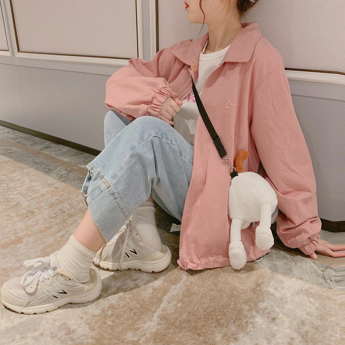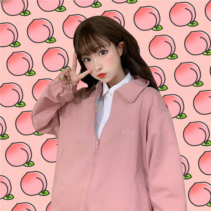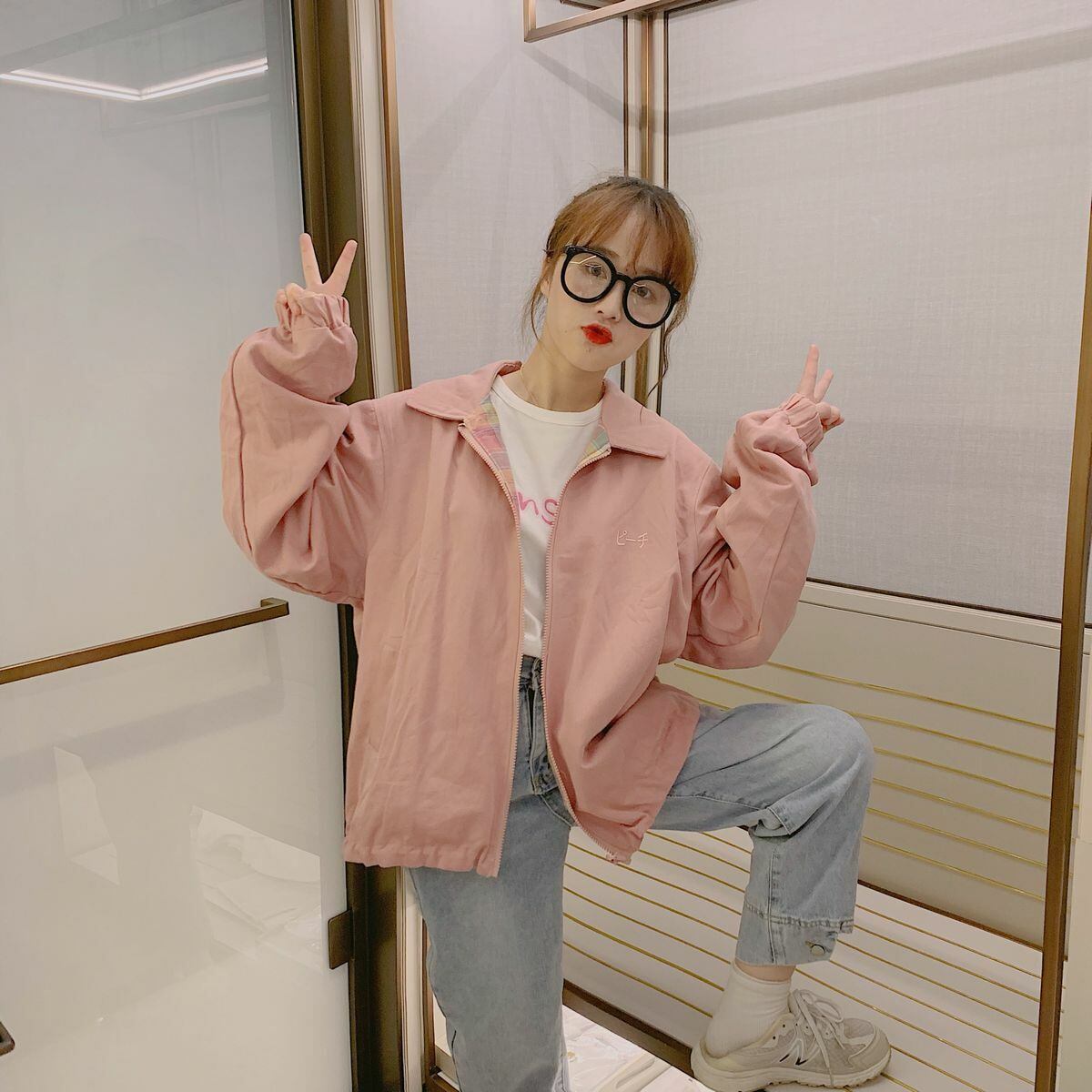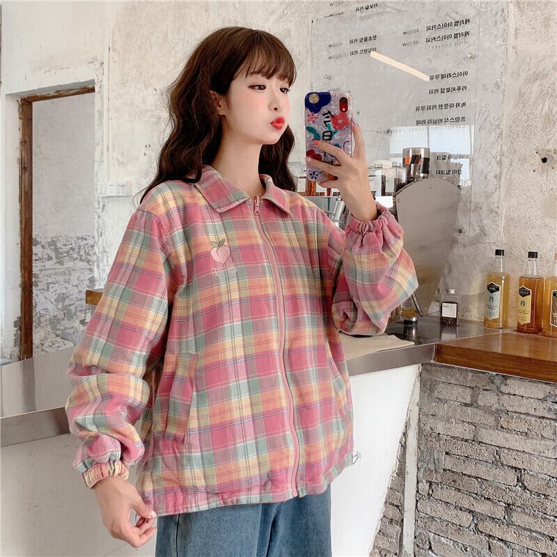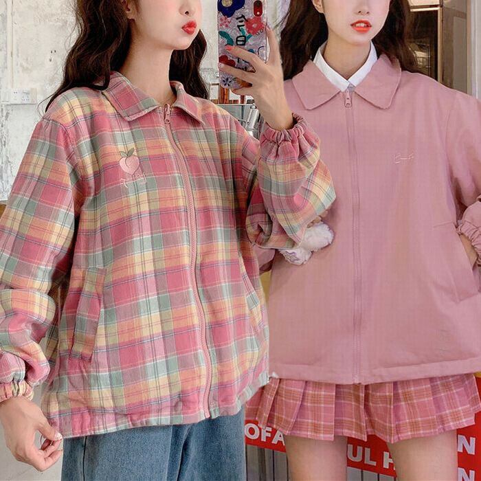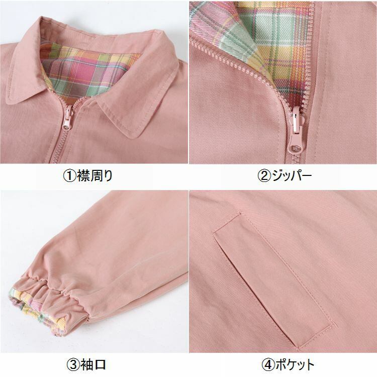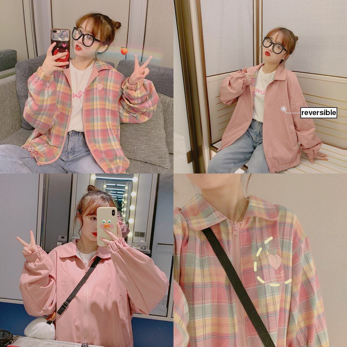 リバーシブル ジャケット レディース チェック柄 無地 ブルゾン アウター ピーチ シンプル ガーリー カジュアル 韓国ファッション / Plaid jacket with loose embroidery on both sides (DTC-601836460242)