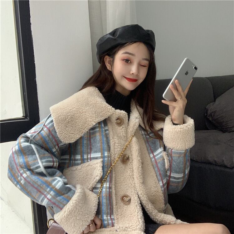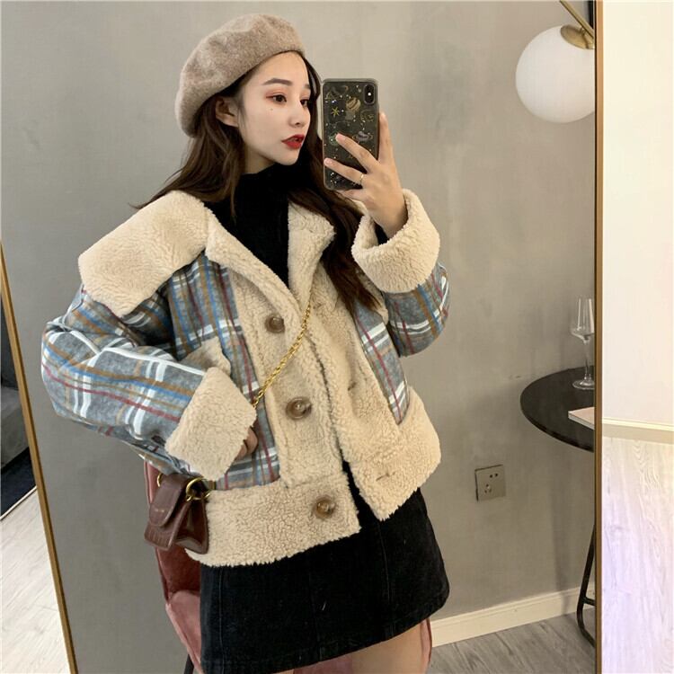 ボアブルゾン ラムウール チェック柄 韓国 ファッション レディース 切り替え 折り襟 ジャケット 両サイドポケット ボアジャケット レトロ ガーリー / Loose Retro Cotton Padded Imitation Lambs Coat (DTC-606122502277)