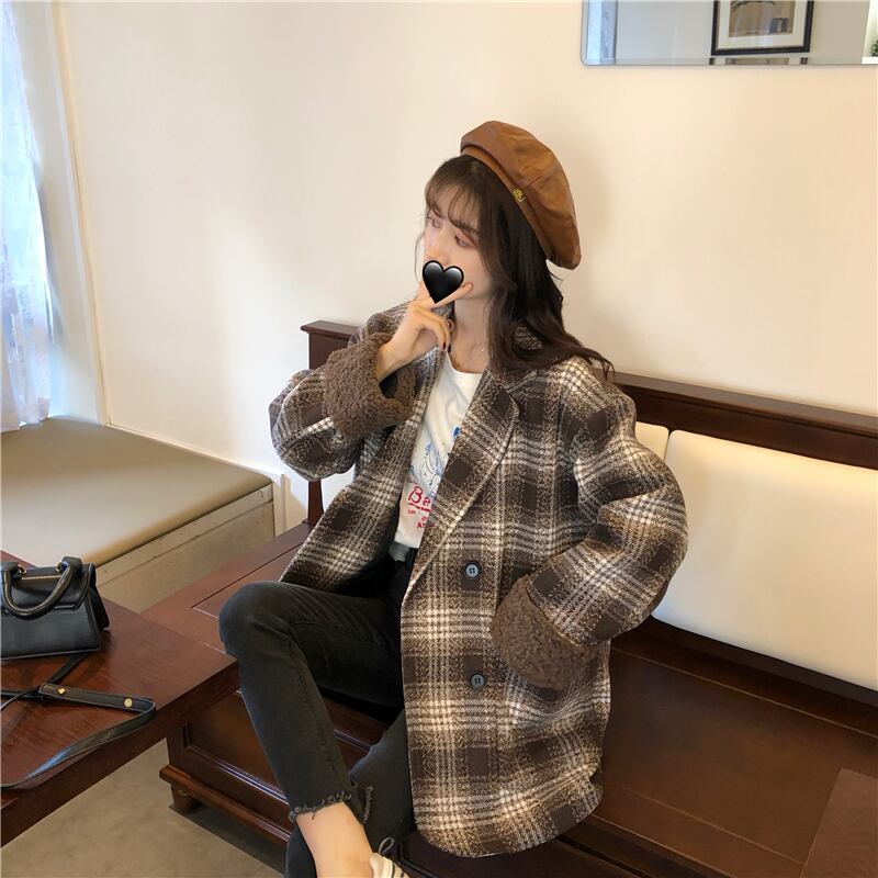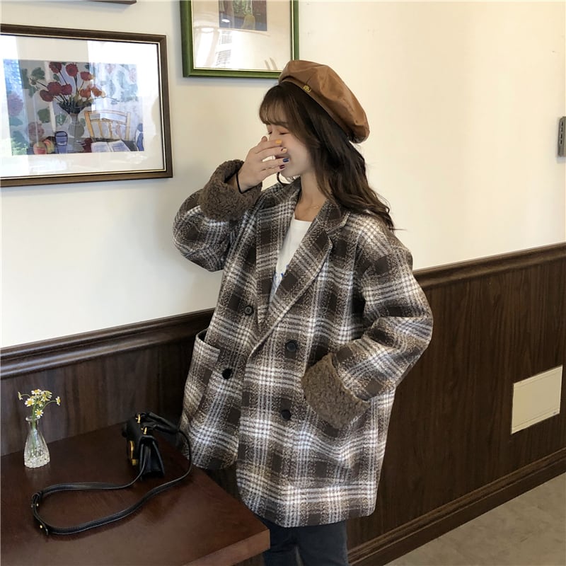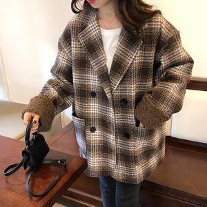 ショートコート チェック柄 袖口ボア 韓国ファッション レディース ジャケット ウールコート ショート丈 ダブルボタン 厚手 レトロ / Hepburn Style Loose Quilt Thick Plaid Wool Coat (DTC-608940745125)