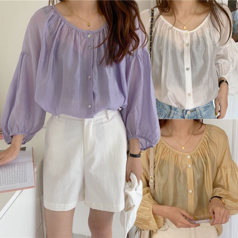 ブラウス 透け 抜き襟 ノーカラー シフォン 七分袖 韓国ファッション レディース トップス シャツ パフ袖 無地 レース シンプル 袖ボリューム ガーリー / Transparent no-collar bubble sleeve shirt (DTC-618973568118)