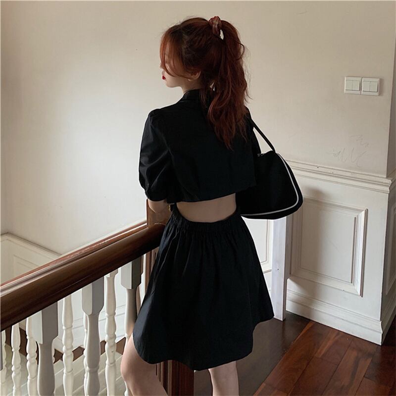 レディース レディースファッション ワンピース シャツワンピース 背中開き 背中見せ バブルスリーブ パフ袖 Aライン シングルブレスト ハイウエスト 無地 フレア シンプル ガーリー フェミニン キレイめ きれいめ おしゃれ 韓国 韓国通販 韓国ショッピング 韓国ファッション おるちゃん オルチャン オルチャンファッション 10代 20代 30代 40代 可愛い かわいい オシャレ プチプラ プチプラファッション 安い 激安 人気