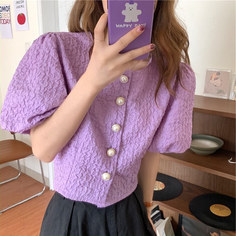 トップス イミテーションパール フロントボタン バルーン袖 パフ袖 韓国ファッション レディース ブラウス カーディガン 半袖 大人カジュアル ショート丈 レトロ ガーリー / Custom fabric pearl buckle princess top (DTC-619927871320)