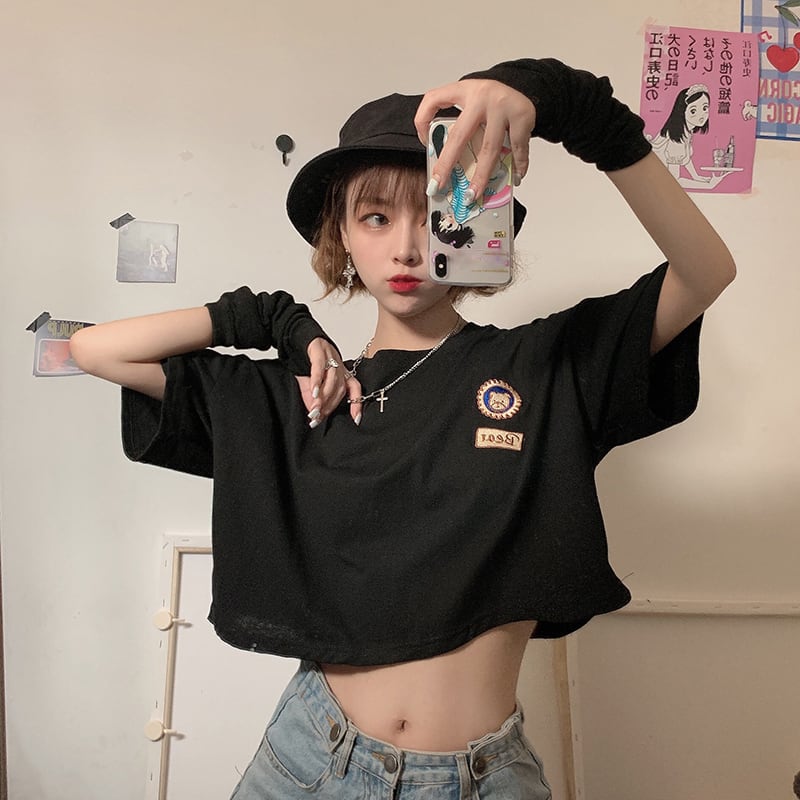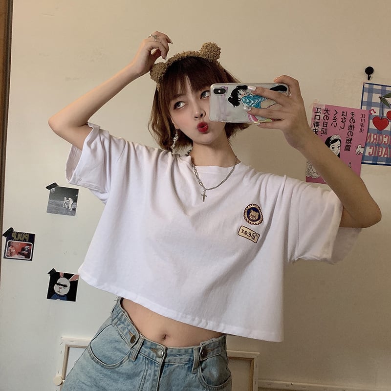 Tシャツ トップス ショート丈 五分袖 くまちゃん 韓国ファッション レディース ベアー ラウンドネック クルーネック 半袖 ガーリー カジュアル / Short casual T-shirt tide (DTC-621732610073)
