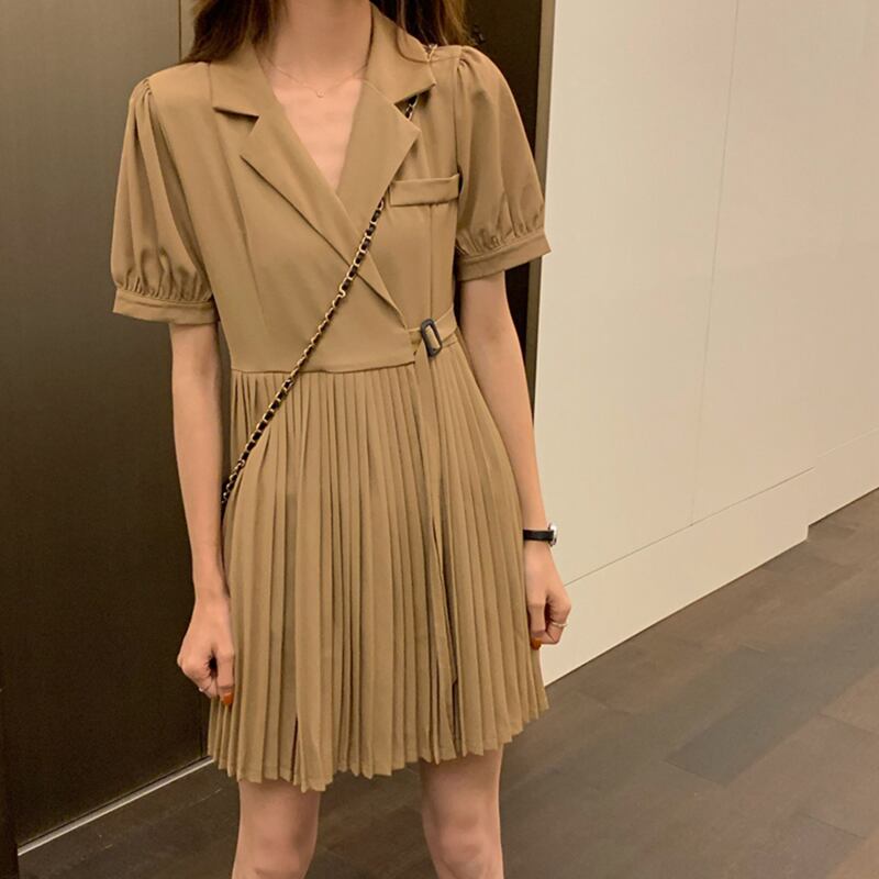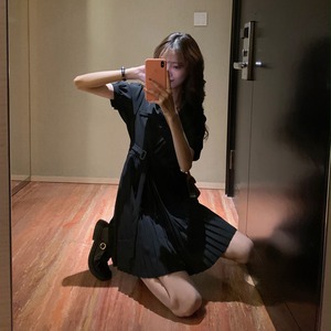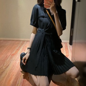 ワンピース プリーツスカート 半袖 ラペル 韓国ファッション レディース ミニワンピース ショート丈 Aライン ハイウエスト かわいい ガーリー レトロ / Hepburn style suit collar pleated dress (DTC-617514165542)