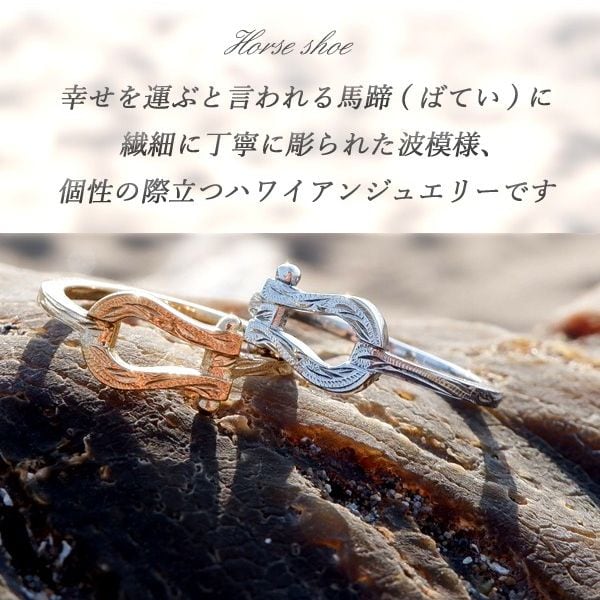 幸せを運ぶと言われる馬蹄(ばてい)に繊細に丁寧に彫られた波模様、個性の際立つハワイアンジュエリーリングです。
