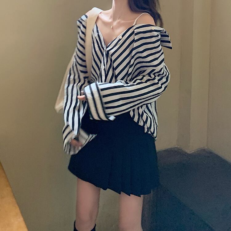 ストライプ柄 シャツ ブラウス オフショルダー 長袖 韓国ファッション レディース 折り襟 ルーズ かわいい ガーリー / Loose Striped Off-Shoulder Skating Top Shirt (DTC-624283952292)