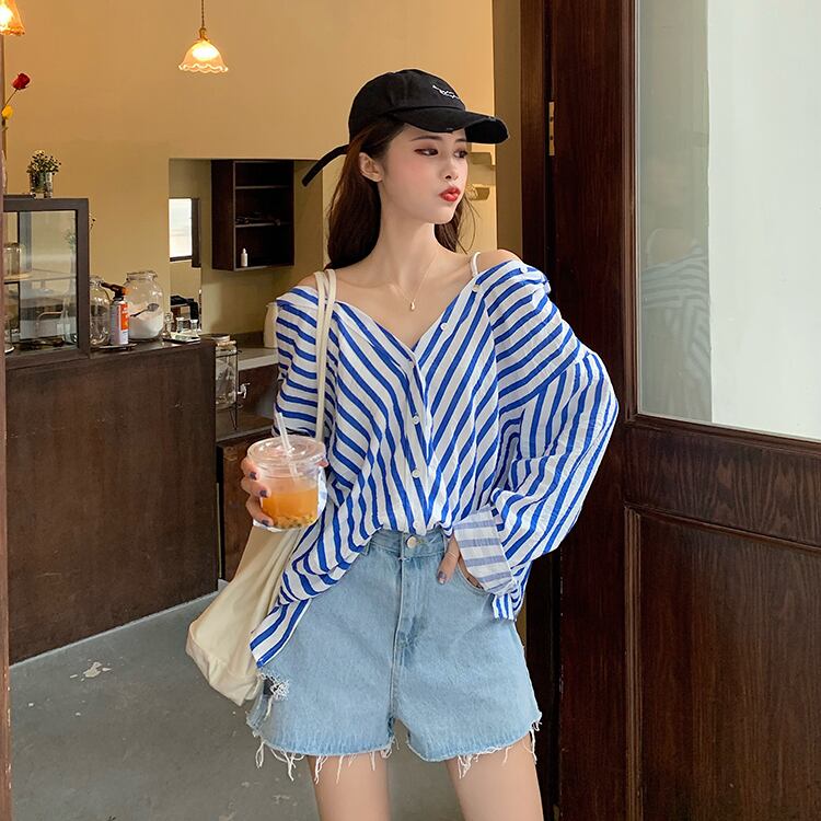 レディース レディースファッション シャツ ブラウス ストライプ 折り襟 長袖 オフショルダー ルーズ ゆったり 大きめ カジュアル ストリートファッション 原宿 韓国 韓国通販 韓国ショッピング 韓国ファッション おるちゃん オルチャン オルチャンファッション 10代 20代 30代 40代 可愛い かわいい オシャレ プチプラ プチプラファッション 安い 激安 人気