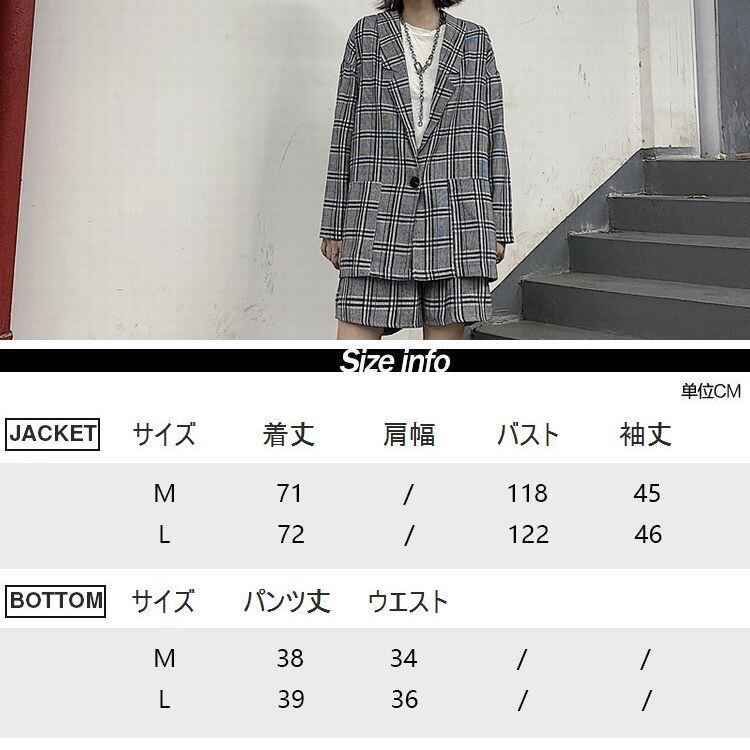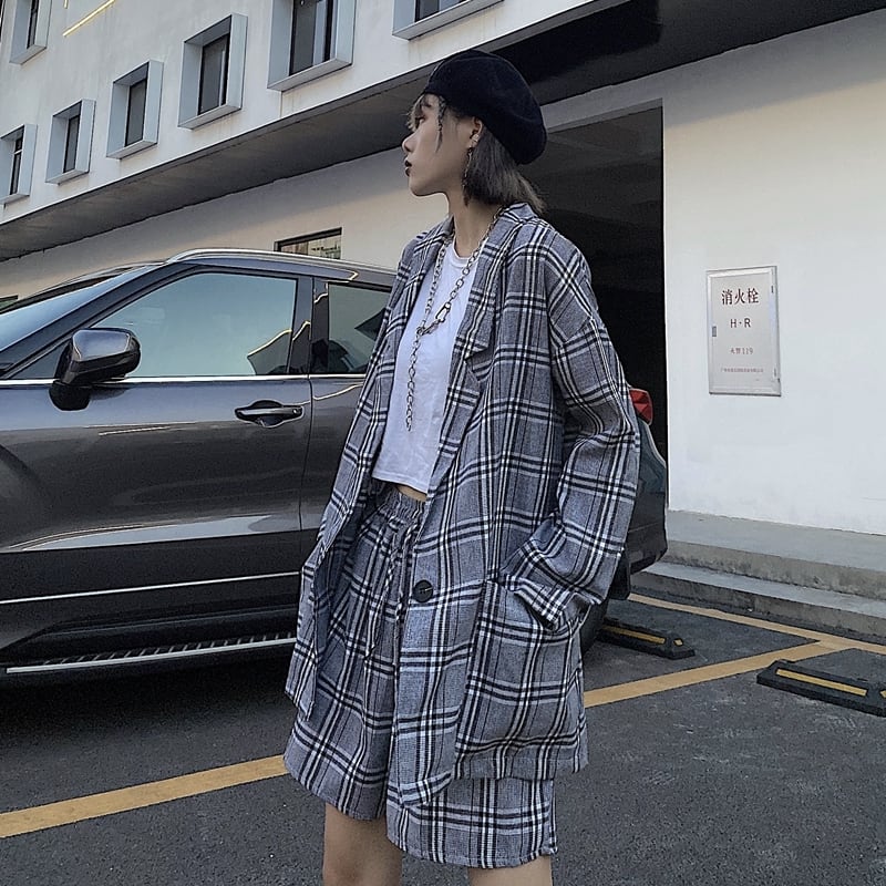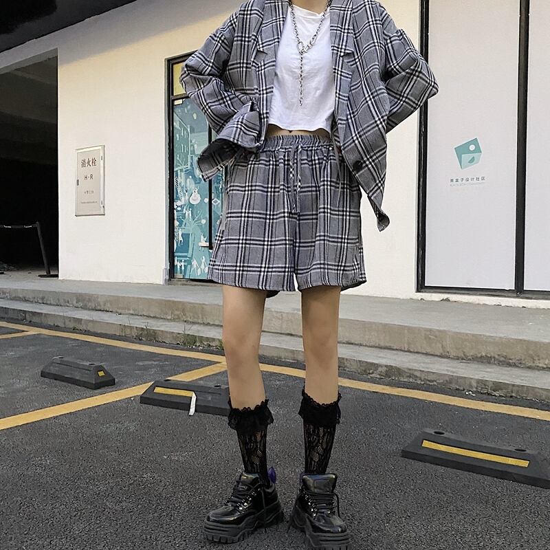 セットアップ チェック柄 ジャケット + ショートパンツ 韓国ファッション レディース 薄い ガジュアル 大人可愛い 大人ガジュアル ガーリー / Thin Section Plaid Top Casual Shorts Two Piece Suit (DTC-624101211694)