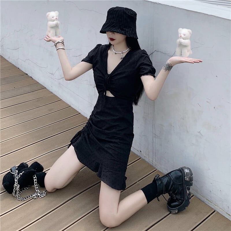 ドット柄 ワンピース 絞り上げ ショート丈 韓国ファッション レディース Vネック ギャザー パフ袖 ハイウエスト ブラック 黒 大人可愛い ガーリー / Waist and thin dress with black design sense (DTC-620250212861)