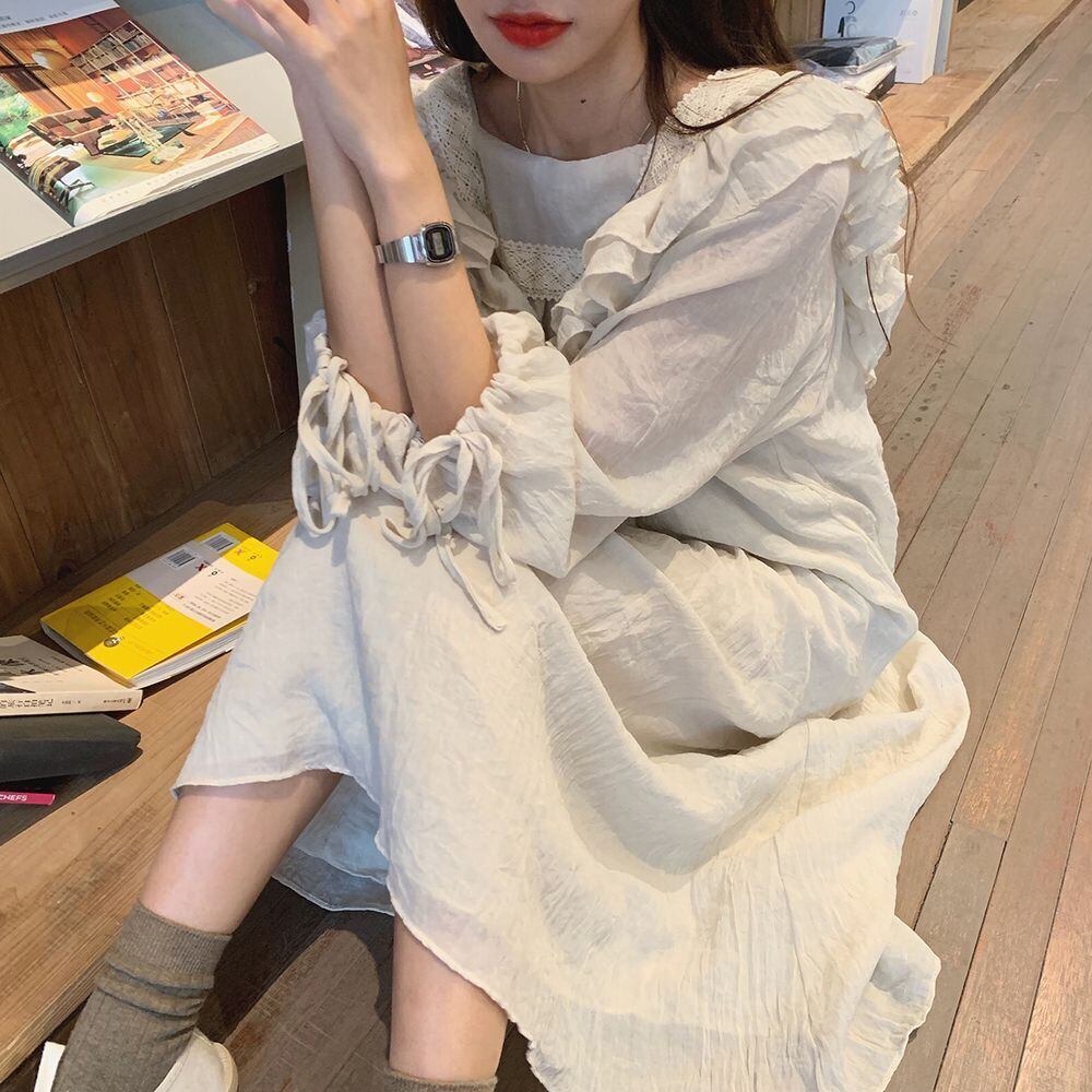 ワンピース フリル 長袖 スクエアネック 韓国ファッション レディース ミドル丈 ゆったりウエスト Aラインスカート レトロ 大人可愛い ガーリー / Retro fairy temperament dress on knees (DTC-601626088666)