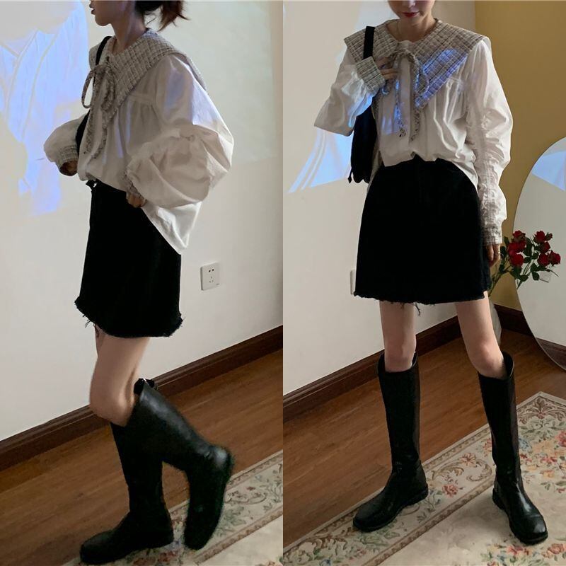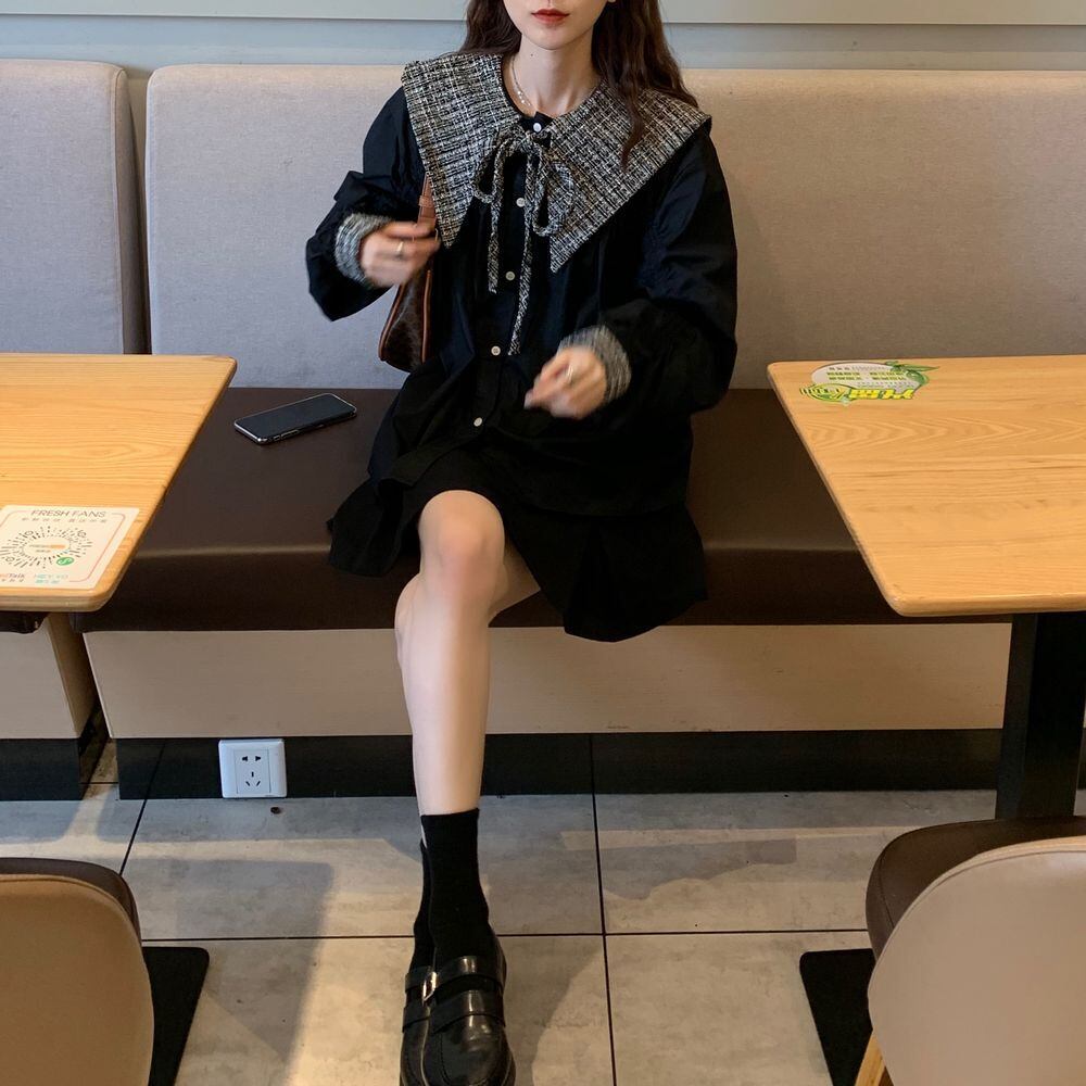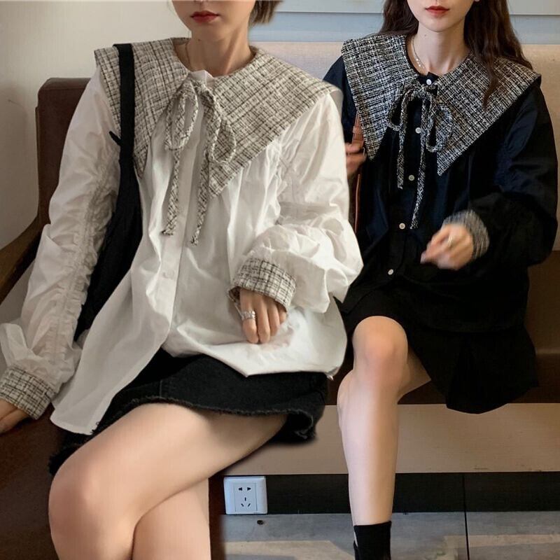 チェック襟付 ブラウス フリル リボン 長袖 韓国ファッション レディース 大きい襟 シャツ トップス チュニック ゆったり 大人可愛い ガーリー / Loose wild long sleeve outer shirt (DTC-625301408424)