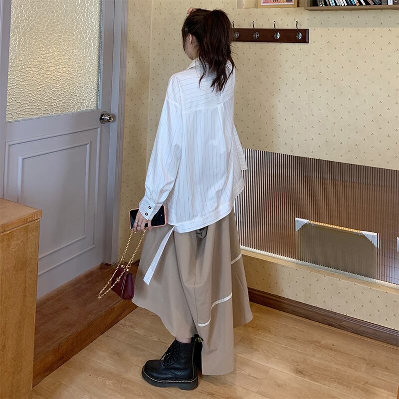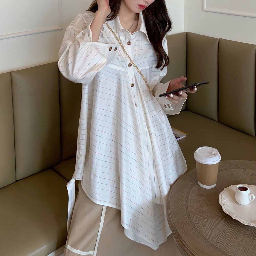 レディース レディースファッション シャツ ストライプ柄 不規則デザイン アシンメトリー 折り襟 長袖 ルーズ 大人可愛い ガーリー フェミニン カジュアル きれいめ おしゃれ 通販 韓国 韓国通販 韓国ショッピング 韓国ファッション おるちゃん オルチャン オルチャンファッション 10代 20代 30代 40代 可愛い かわいい お洒落 レディス プチプラ 激安 安い コーデ コーディネイト 人気 おすすめ