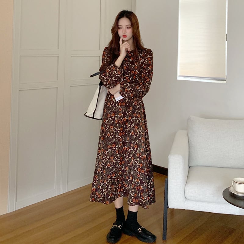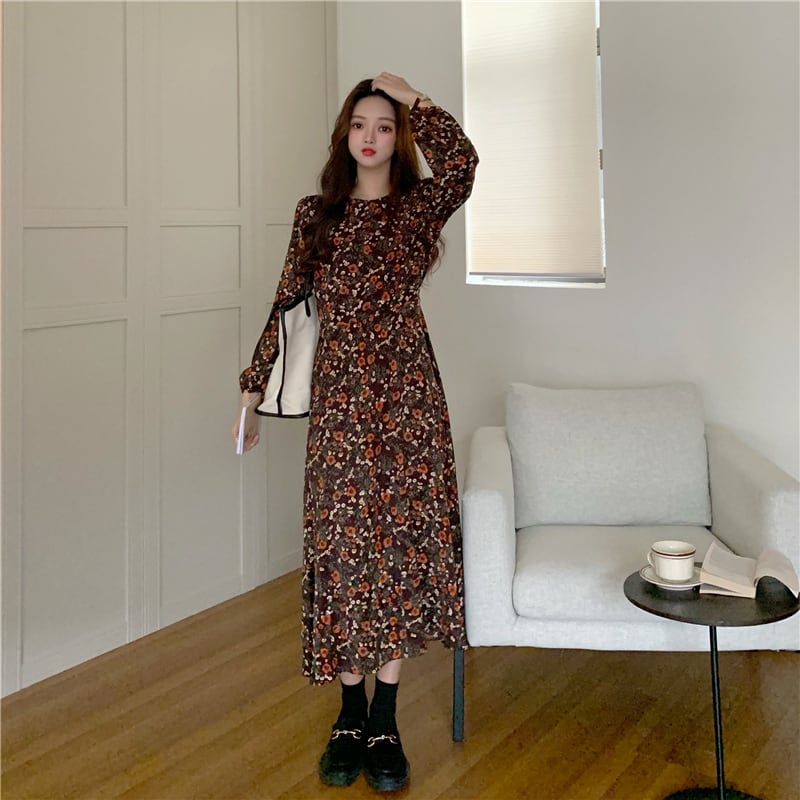 レディース レディースファッション ワンピース 花柄 ラウンドネック ハイウエスト ロング丈 長袖 ゆったり 大人可愛い ガーリー フェミニン カジュアル きれいめ おしゃれ 通販 韓国 韓国通販 韓国ショッピング 韓国ファッション おるちゃん オルチャン オルチャンファッション 10代 20代 30代 40代 可愛い かわいい お洒落 レディス プチプラ 激安 安い コーデ コーディネイト 人気 おすすめ