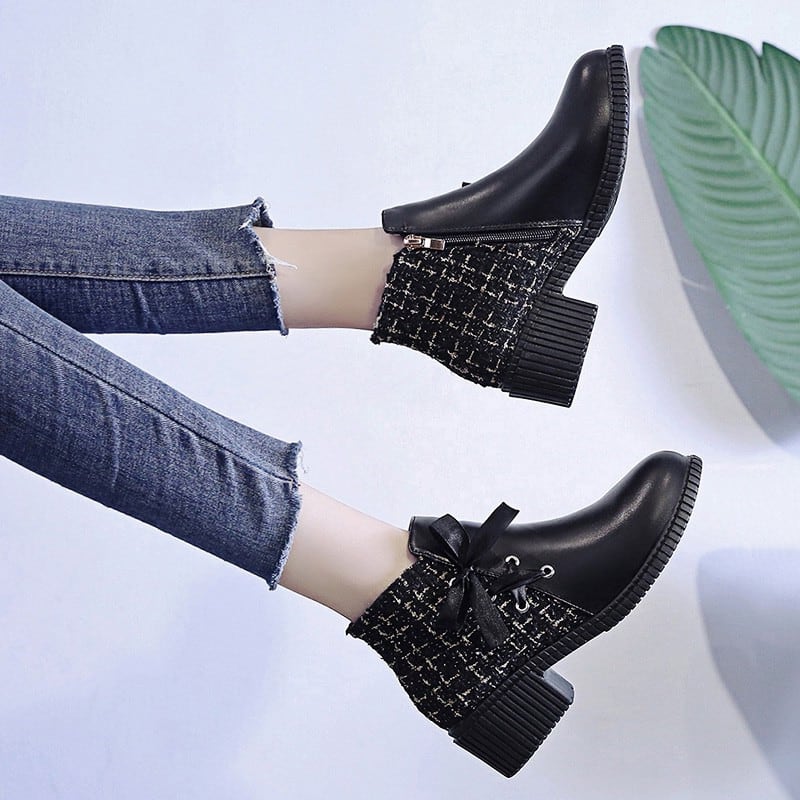 異素材切り替え ショートブーツ サイドジッパー 5cm ヒール 太ヒール 韓国ファッション レディース 歩きやすい 履きやすい かわいい おしゃれ 大人可愛い (DTC-629186523306)