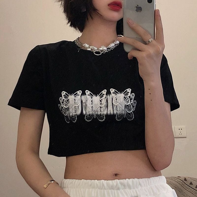 Tシャツ バタフライ柄 クロップド丈 ショート丈 半袖 へそ出し ブラック レトロ 韓国ファッション レディース 大人可愛い ガーリー カジュアル ストリート系 / Short Crop Top Butterfly Black Loose Short Sleeve T-shirt Tide (DTC-619404493846)