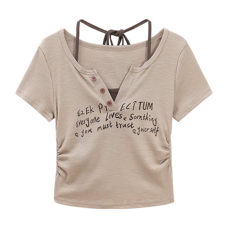 レディース レディースファッション フェイクレイヤード Tシャツ ホルターネック レタープリント ショート丈 半袖 レトロ 大人可愛い ガーリー フェミニン おしゃれ 通販 韓国 韓国通販 韓国ショッピング 韓国ファッション おるちゃん オルチャン オルチャンファッション 10代 20代 30代 40代 可愛い かわいい お洒落 レディス プチプラ 激安 安い コーデ コーディネイト 人気 おすすめ